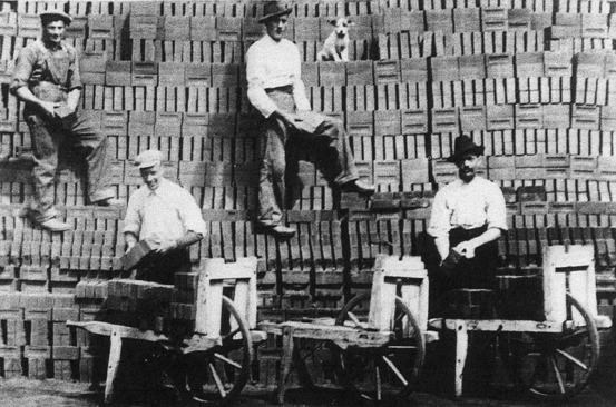 After the bricks cooled for three or four days, men loaded them onto wheelbarrows and took them to the beach. There they threw away the culls—bricks that were broken, deformed, melted, or stuck together—onto Brickyard Beach, and stacked the good bricks to await the scow.