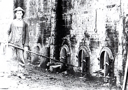 During the firing process, wheelbarrow-loads of coal were rolled up a ramp and across the top of the kiln under the high wooden roof. Plugs were removed from holes in the top of the kiln while the coal was shovelled in to increase the temperature to about 2000°F.