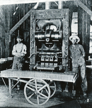 The first step in the process was to crush, grind and screen the shale to a fine powder in a “dry pan crusher”, rather like a huge rotary kitchen sieve. The crushed shale was mixed with water, and the resultant slurry was screened fine, and delivered through a chute to the press. On Gabriola, they pressed four bricks at a time in a hand-operated hydraulic press.
