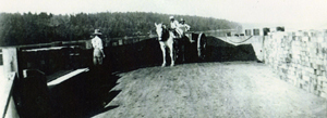 Harry Finnamore, his dog, co-workers, wooden wheelbarrows, and bricks